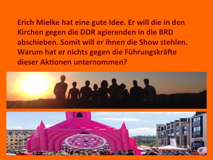 Erich Mielke hat eine gute Idee. Er will die in den Kirchen gegen die DDR agierenden in die BRD abschieben. Somit will er ihnen die Show stehlen. Warum hat er nichts gegen die Führungskräfte dieser Aktionen unternommen?