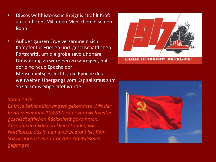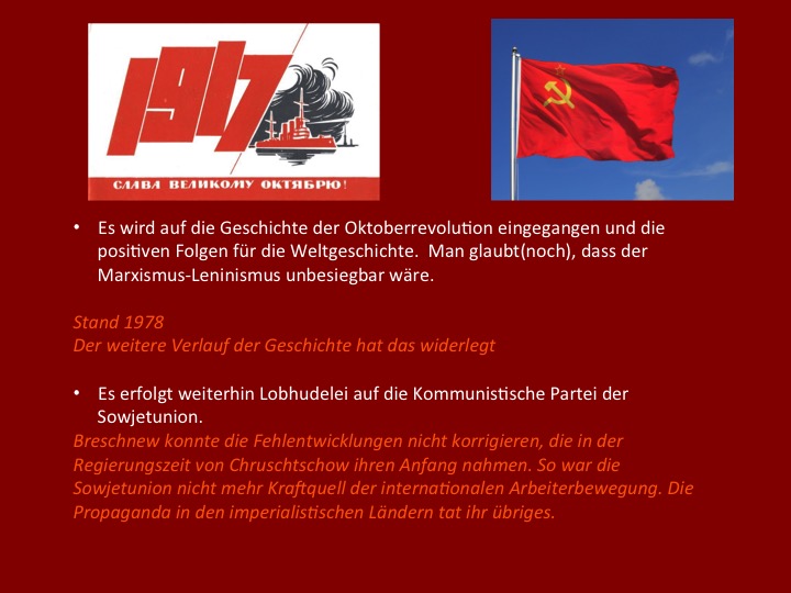 • Es wird auf die Geschichte der Oktoberrevolution eingegangen und die positiven Folgen für die Weltgeschichte.  Man glaubt(noch), dass der Marxismus-Leninismus unbesiegbar wäre.