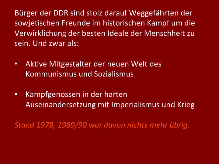 Bürger der DDR sind stolz darauf Weggefährten der sowjetischen Freunde im historischen Kampf um die Verwirklichung der besten Ideale der Menschheit zu sein. Und zwar als: