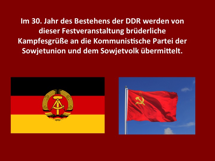Im 30. Jahr des Bestehens der DDR werden von dieser Festveranstaltung brüderliche Kampfesgrüße an die Kommunistische Partei der Sowjetunion und dem Sowjetvolk übermittelt.