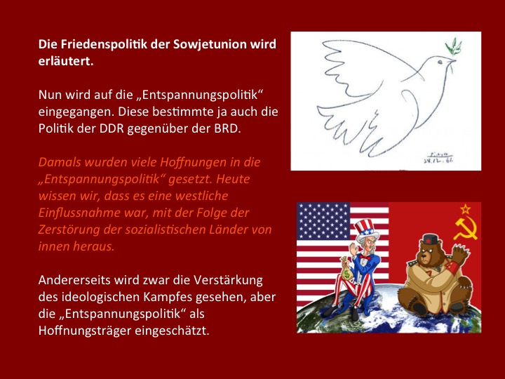 Damals wurden viele Hoffnungen in die „Entspannungspolitik“ gesetzt. Heute wissen wir, dass es eine westliche Einflussnahme war, mit der Folge der Zerstörung der sozialistischen Länder von innen heraus.